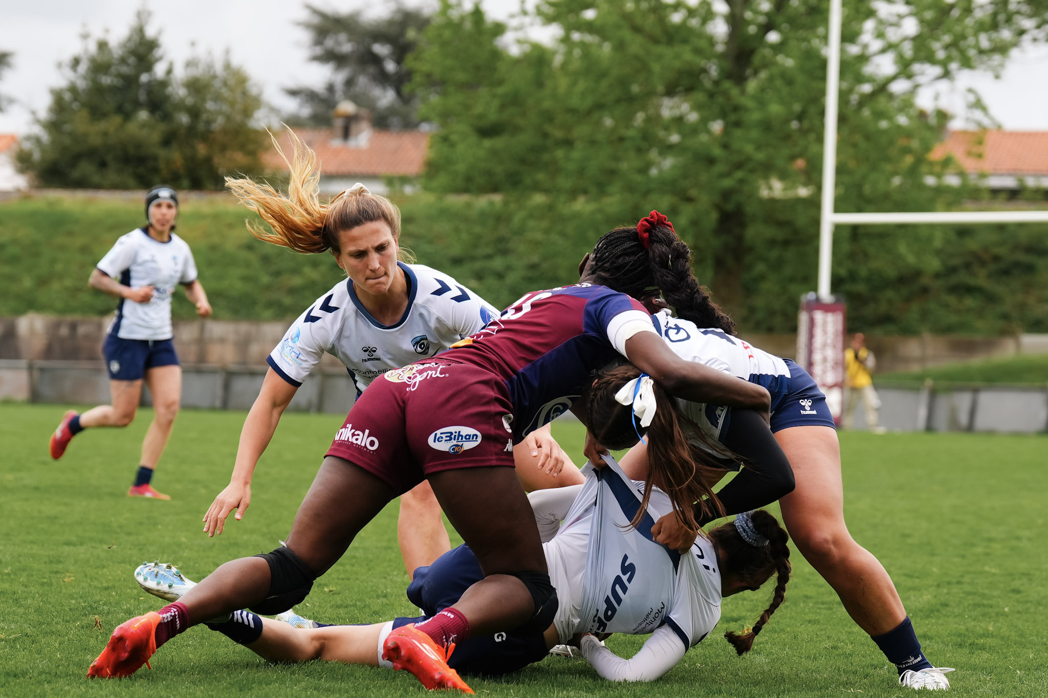 Les Lionnes réagissent rapidement et prennent le dessus dans le jeu. Sur un premier temps fort, B. Mailagi (12’) inscrit le premier essai, transformé par E. Coudert.